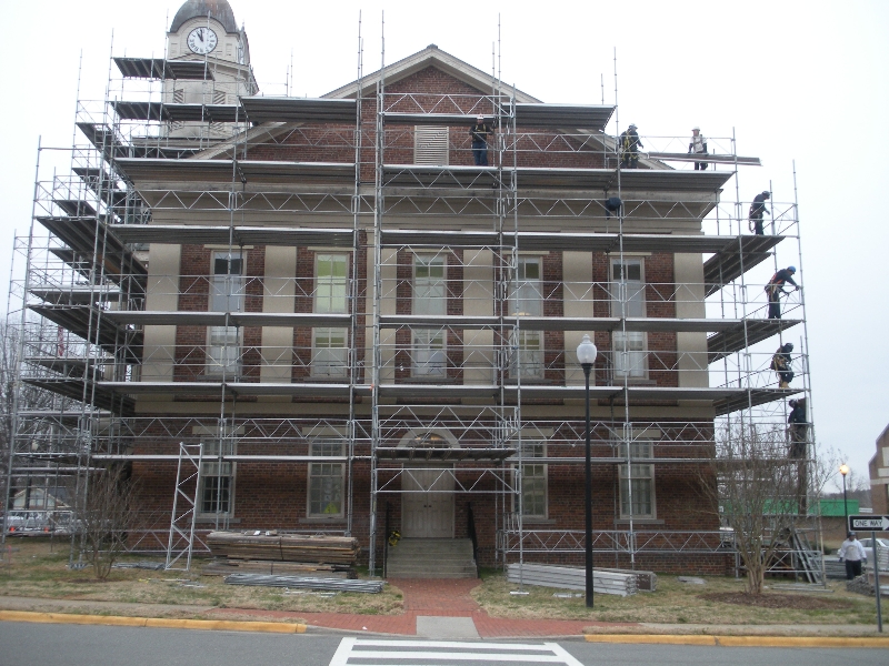 Scaffolding Solutions erected scaffolding to support the renovation of the old courthouse in Warrenton, Virginia. Six levels of scaffolding had to be constructed around the clock tower approximately 80 feet above the street level.