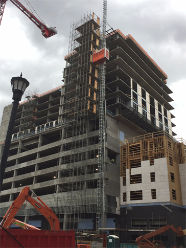 Scaffolding Solutions designed a system that left street access open and allowed contractors to access the building with the Scando 650. The OCTO Platform provided roof access up to 185 feet high and access platforms starting at the 8th floor added support for 7200 lbs.