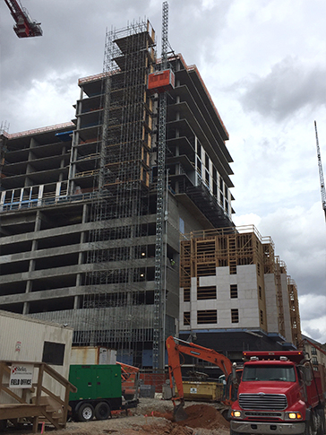 One particularly unique aspect of the Trinity Dome project was the installation of a personnel hoist (construction elevator) to move workers and materials up and down from the base of the elevated platform to the upper decks of the scaffolding in the dome. Scaffolding Solutions was the access supplier… Read more.”