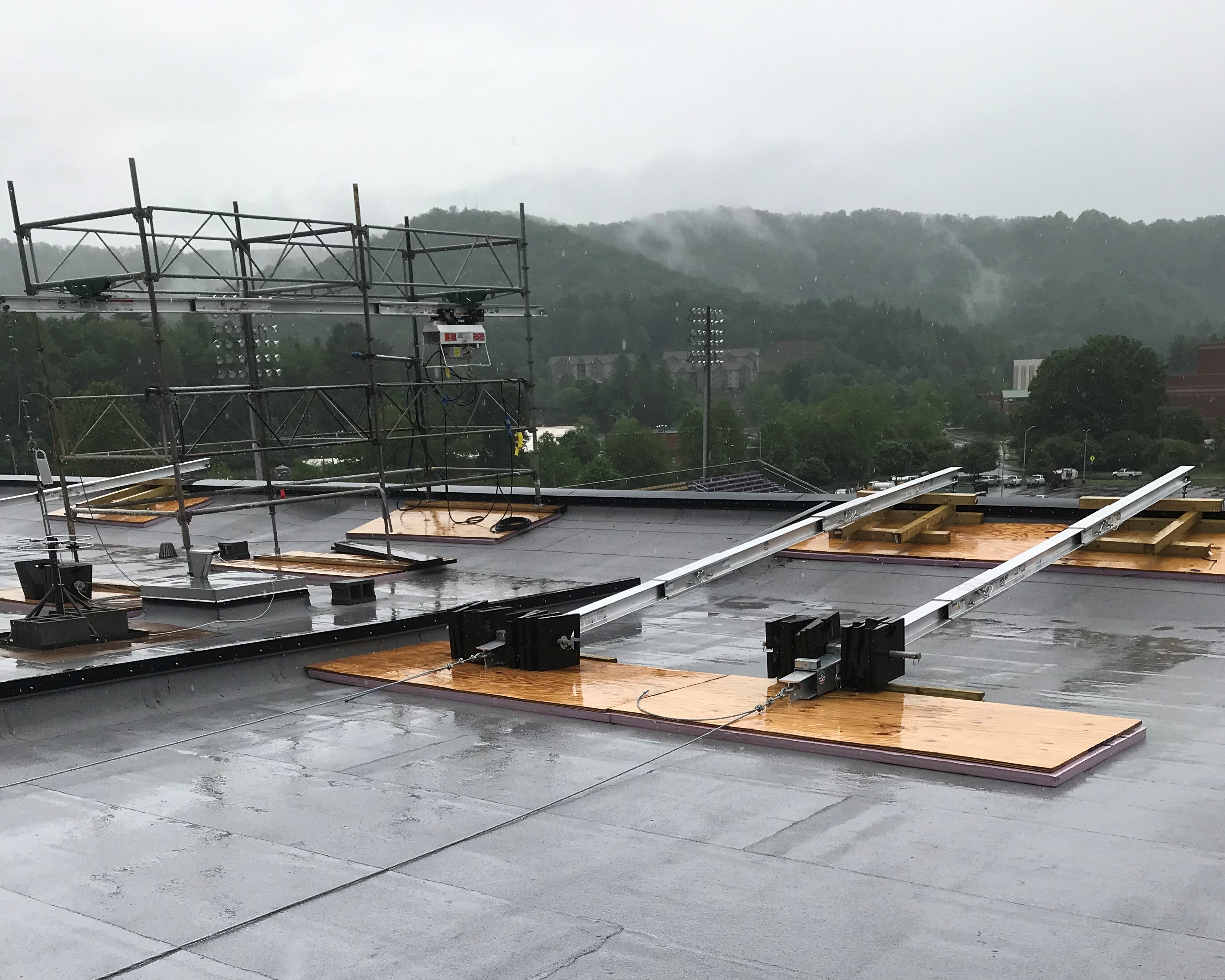 However, WCU’s basketball stadium had no such anchor points. If they used a swing stage scaffold, it would involve either an expensive or a creative solution.